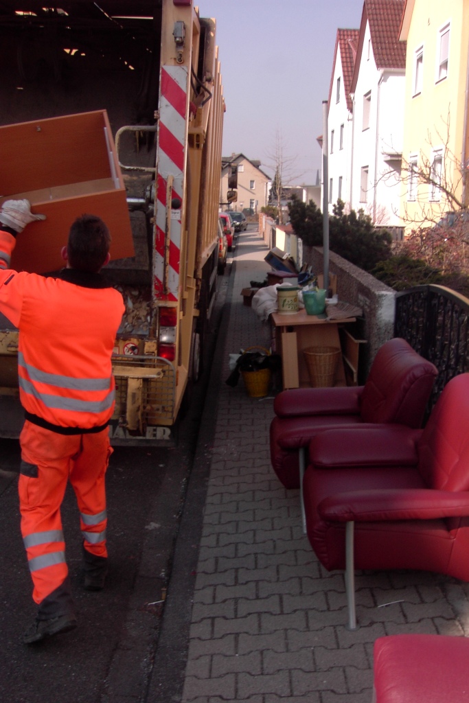 Während ein Sperrmüllauto durch die Straße fuhr und alles pressend und malmend abräumte, ging zuerst von mir unbemerkt eine junge Frau aus dem Hoftor und stellte etwas auf den Bürgersteig. Sie fragte die Mülwerker, ob die noch ihren Müllbeutel mitnehmen könnten, da ihre Mülltonne beim Nachbarn stand. Die Müllwerker meinten, dass sie das tun könnte, wenn sie "durchgepresst" hätten. Schnell noch stellte die Frau anderen Sperrmüll aus der Garage zum Haufen auf die Straße.