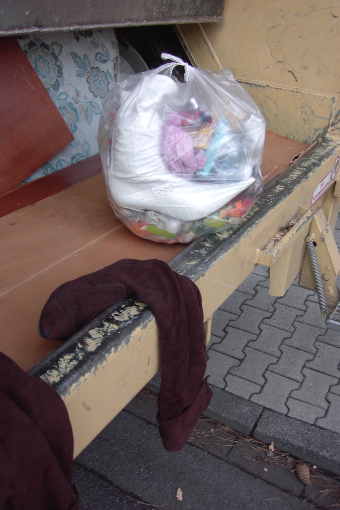 Die großen zermalmten Möbelteile rutschten beim Hochpressen über den kleinteiligen platt gepressten Sperrmüll meiner Bekannten und so gab das Müllauto für wenige Augenblicke andere Teile aus dem gelben Korb frei; darunter auch die oft von ihr getragenen Alltagstiefel, die sich eingeklemmt im Korb auch jetzt nicht mehr befreien konnten.