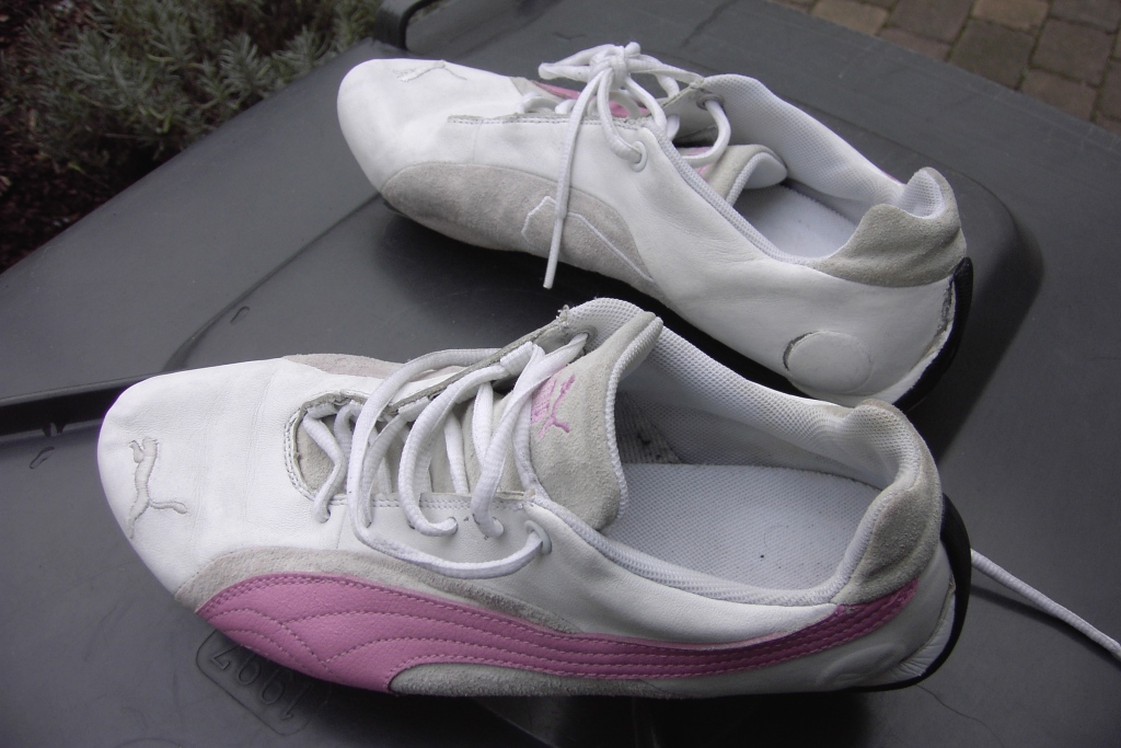Die beiden Pumas habe ich "restauriert" und die weiß-braunen sind bis zum heutigen Tag (wieder) noch bei einer Schülerin im täglichen Einsatz und die Müllabfuhr kriegt die wohl noch nicht so schnell. Die weiß-rosa Pumas habe ich auch "restauriert" aber die Pressschäden habe ich sichtbar gelassen.