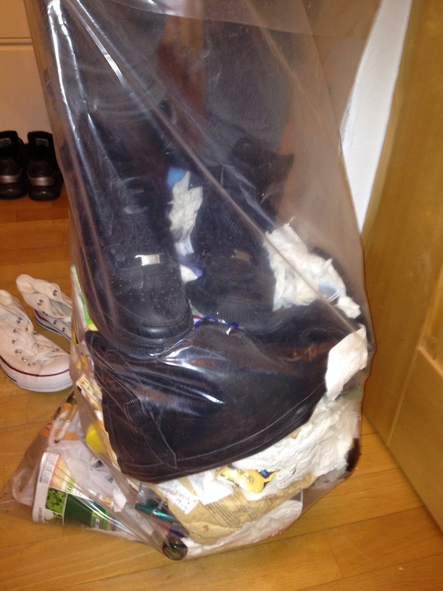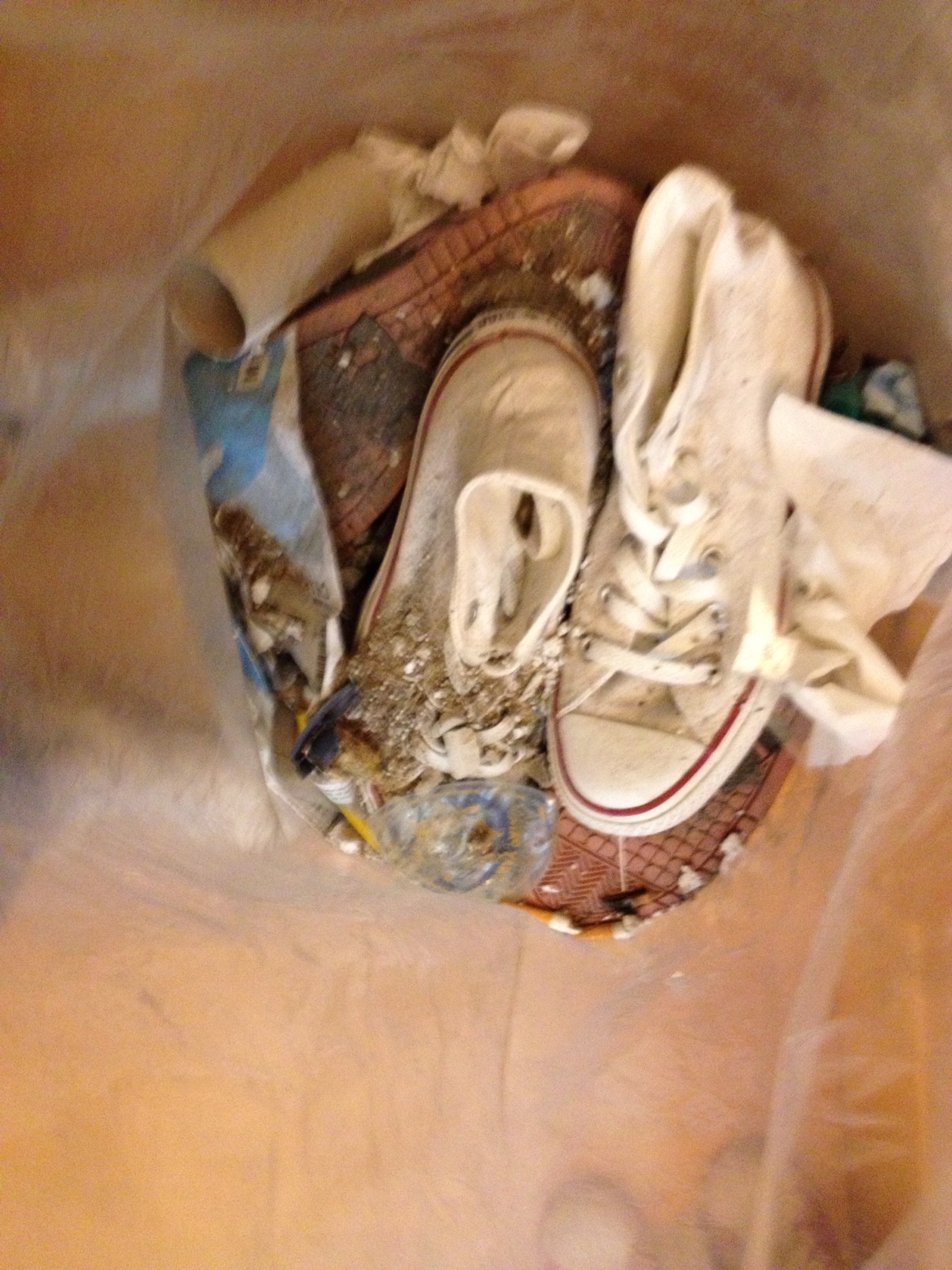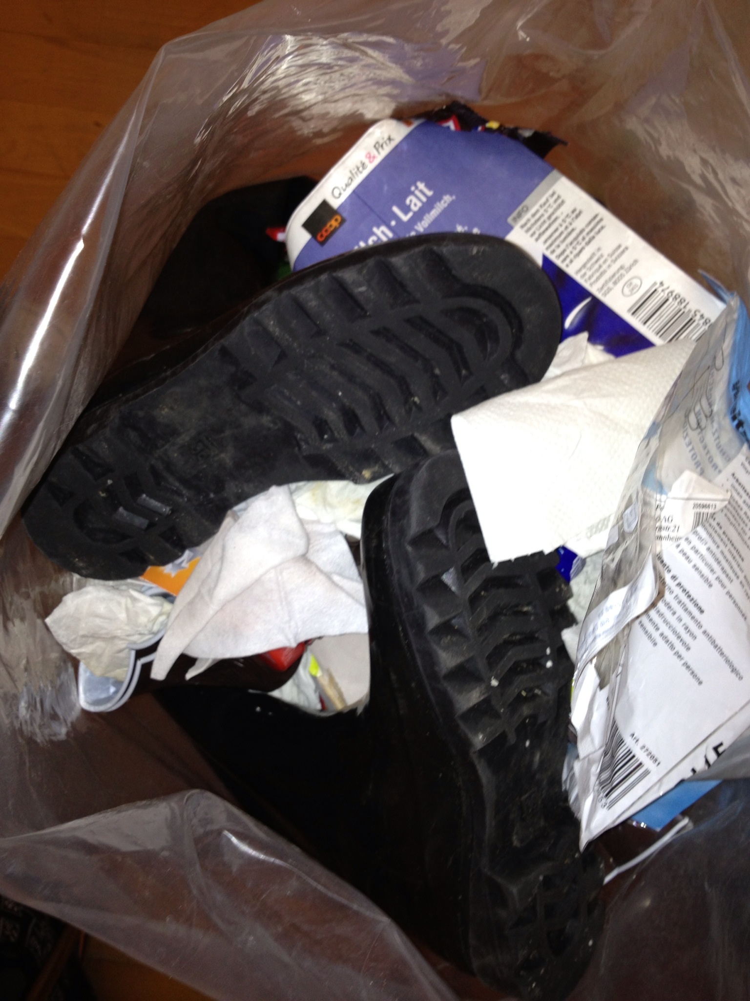 ausmisten, schuhe mit müll zusammen in den beutel.