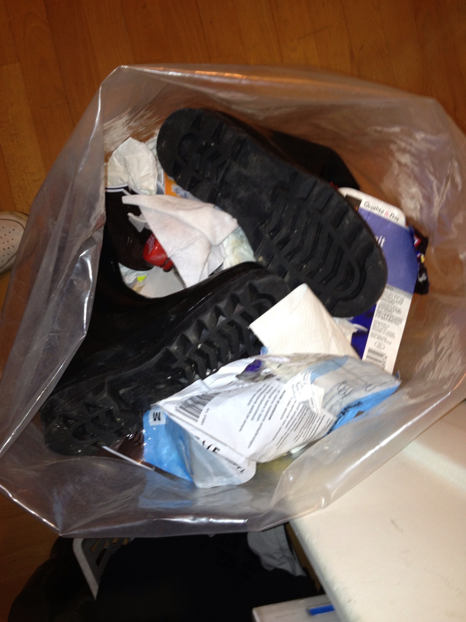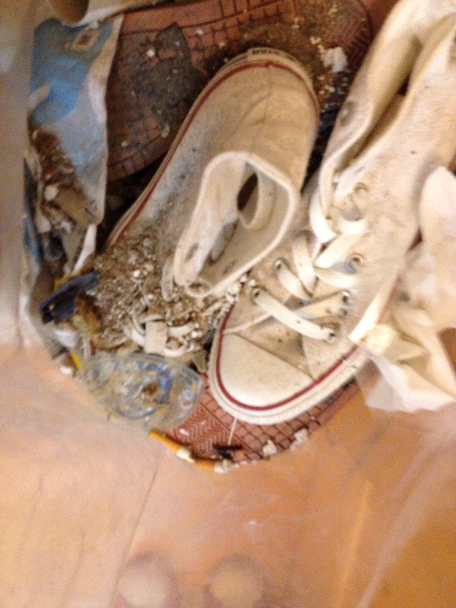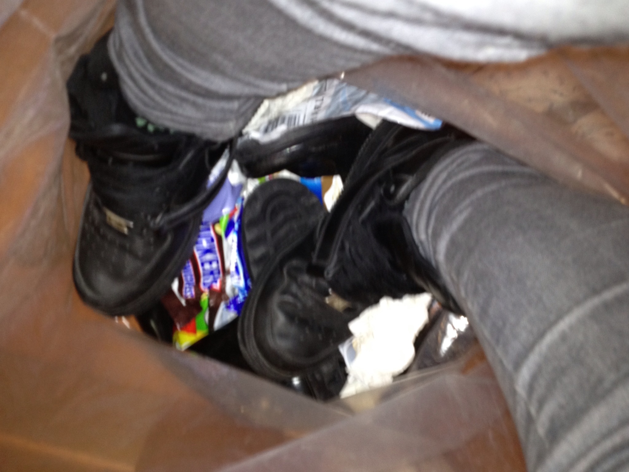 ausmisten, schuhe mit müll zusammen in den beutel.