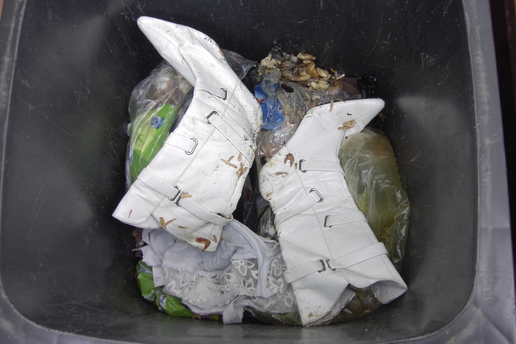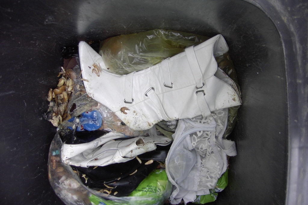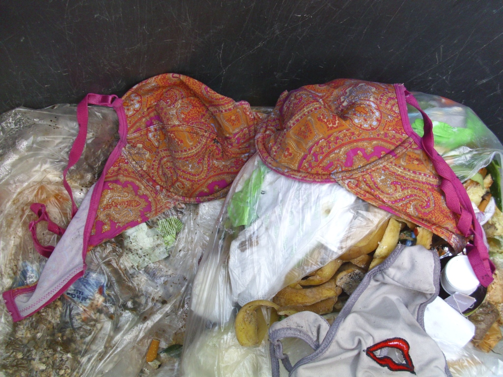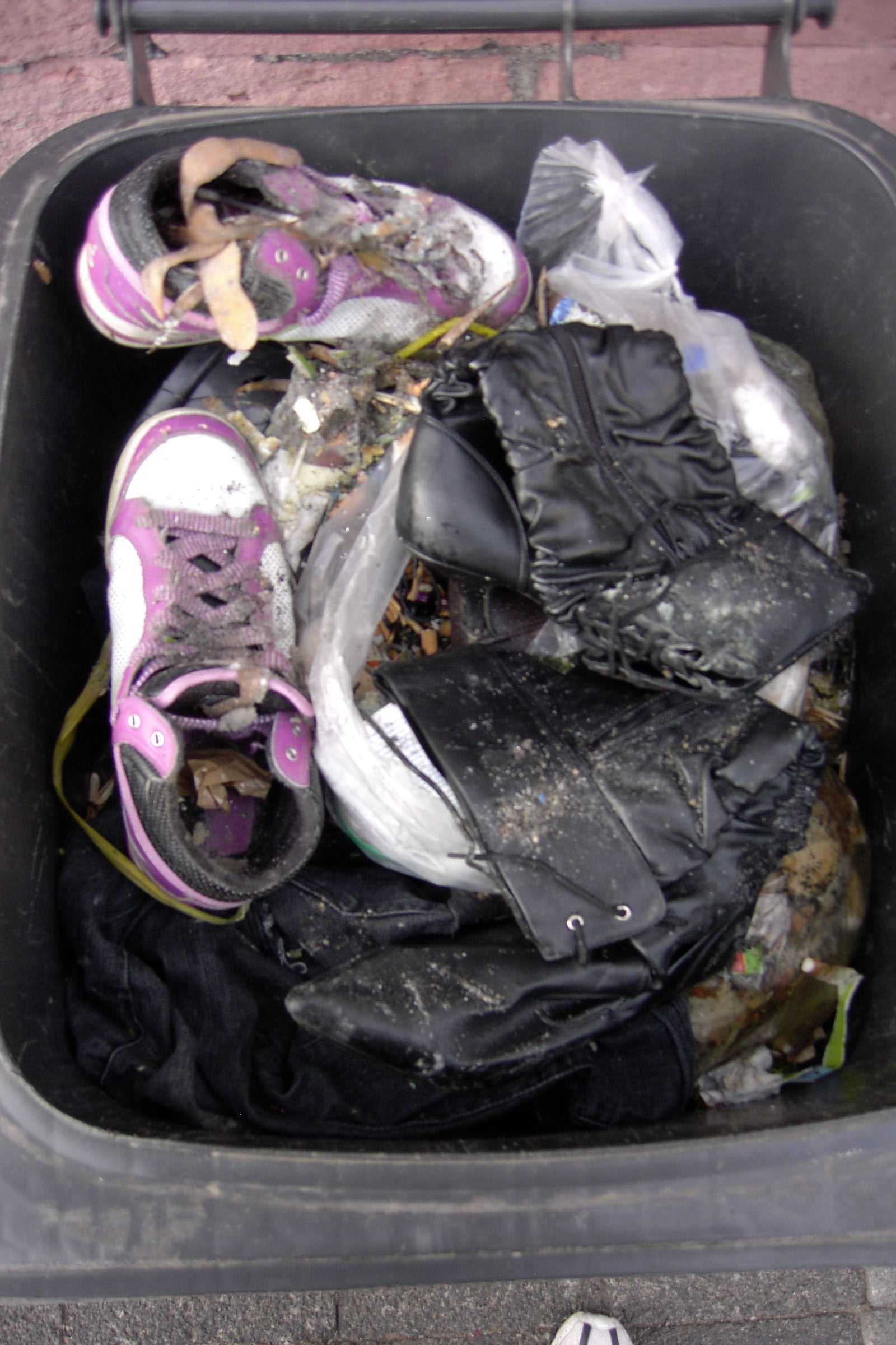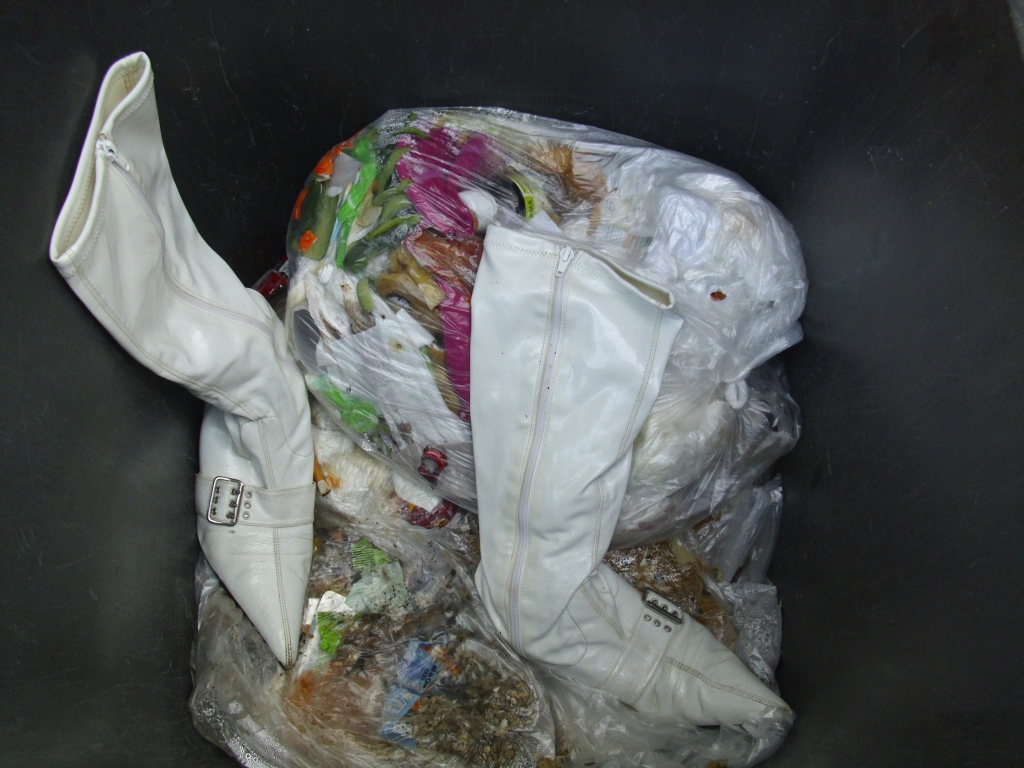 Durch die vielen Personen fällt natürlich einiges an „normalem“ Hausmüll an und auch nicht wenige Küchenabfälle. Aus Hygienegründen kommt davon nichts in die Biotonne. So ergibt sich eine „bunte“ Mischung in unserer Restmülltonne, die man gar nicht vollständig aufzählen kann: Nudelreste und Designerjeans, abgenagte Knochen zu Stringtangas, Kartoffelbrei klebt in Stiefeln, Zigarettenkippen sorgen für echt üblen Gestank in Sneakers, Kehrricht wird auf BHs geschüttet und auslaufende Parfum-Flacons in einer alten Handtasche, versuchen vergeblich gegen den penetranten Müllgeruch der Mülltonne „anzustinken“, zerschlissene geile Oberteile zu welken Salatblättern, verschwitzte, käsige Sneakersöckchen und Nylons liegen bei Badezimmerabfällen, abgestöckelte Pumps und verlatschte Ballerinas kriegen Glas- oder Porzellanscherben ab und ausgekratztes altes Frittenfett auf Mäntel oder Jacken, oder noch viel schlimmer: flüssigheiß in alte Stiefel gegossen.