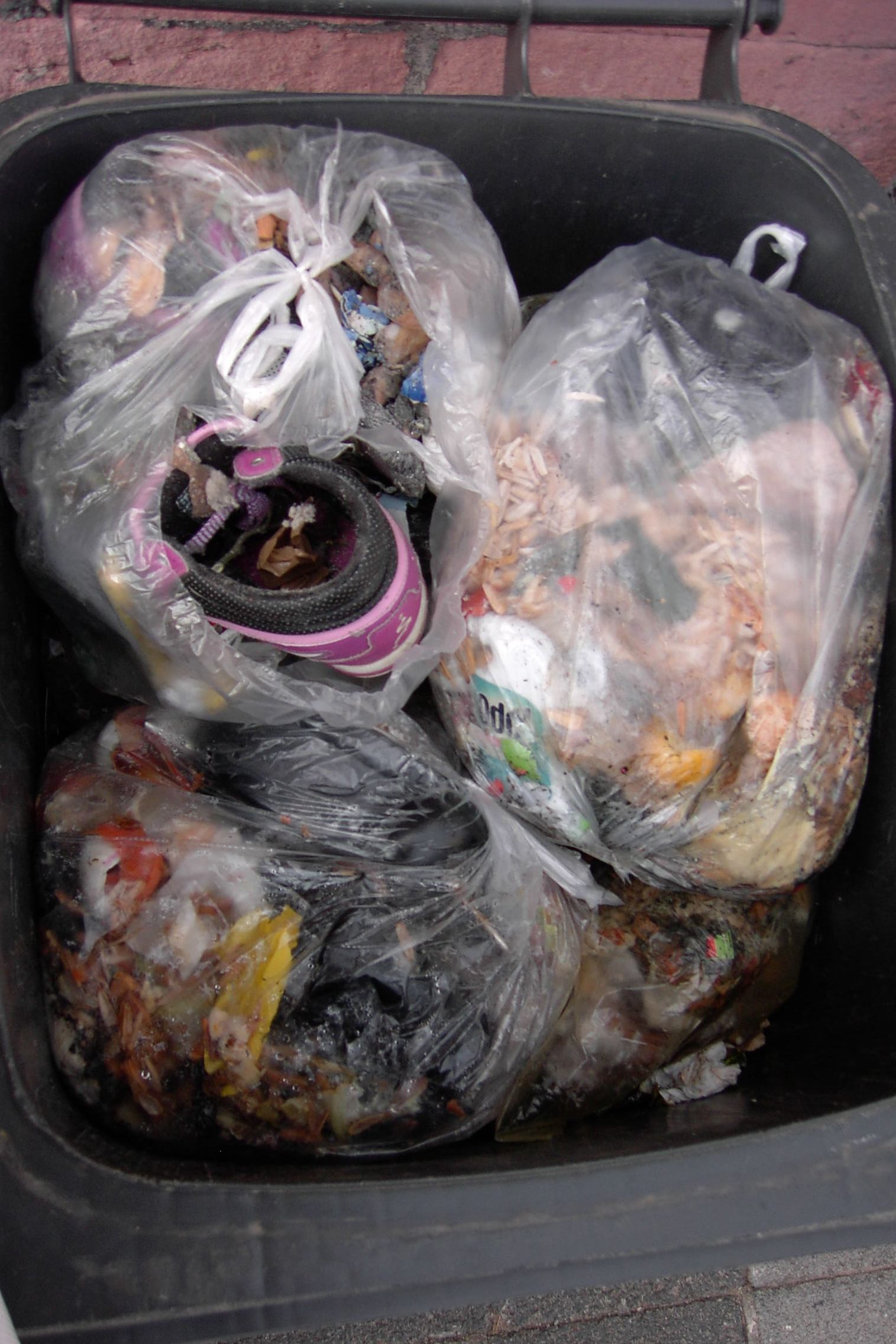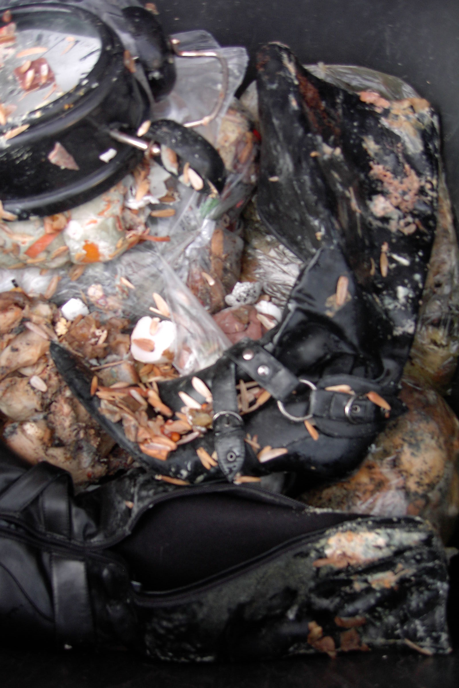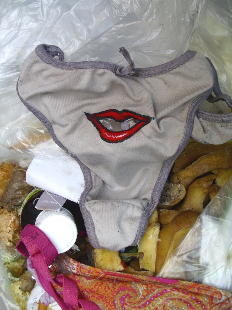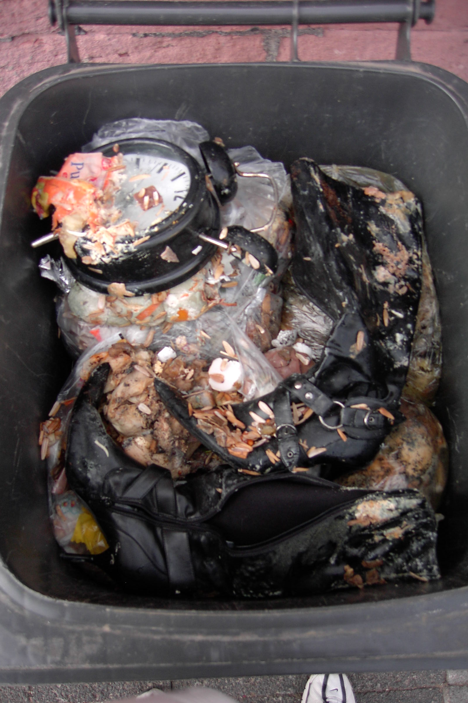 Durch die vielen Personen fällt natürlich einiges an „normalem“ Hausmüll an und auch nicht wenige Küchenabfälle. Aus Hygienegründen kommt davon nichts in die Biotonne. So ergibt sich eine „bunte“ Mischung in unserer Restmülltonne, die man gar nicht vollständig aufzählen kann: Nudelreste und Designerjeans, abgenagte Knochen zu Stringtangas, Kartoffelbrei klebt in Stiefeln, Zigarettenkippen sorgen für echt üblen Gestank in Sneakers, Kehrricht wird auf BHs geschüttet und auslaufende Parfum-Flacons in einer alten Handtasche, versuchen vergeblich gegen den penetranten Müllgeruch der Mülltonne „anzustinken“, zerschlissene geile Oberteile zu welken Salatblättern, verschwitzte, käsige Sneakersöckchen und Nylons liegen bei Badezimmerabfällen, abgestöckelte Pumps und verlatschte Ballerinas kriegen Glas- oder Porzellanscherben ab und ausgekratztes altes Frittenfett auf Mäntel oder Jacken, oder noch viel schlimmer: flüssigheiß in alte Stiefel gegossen.