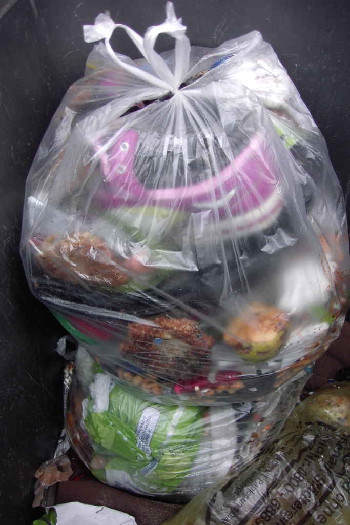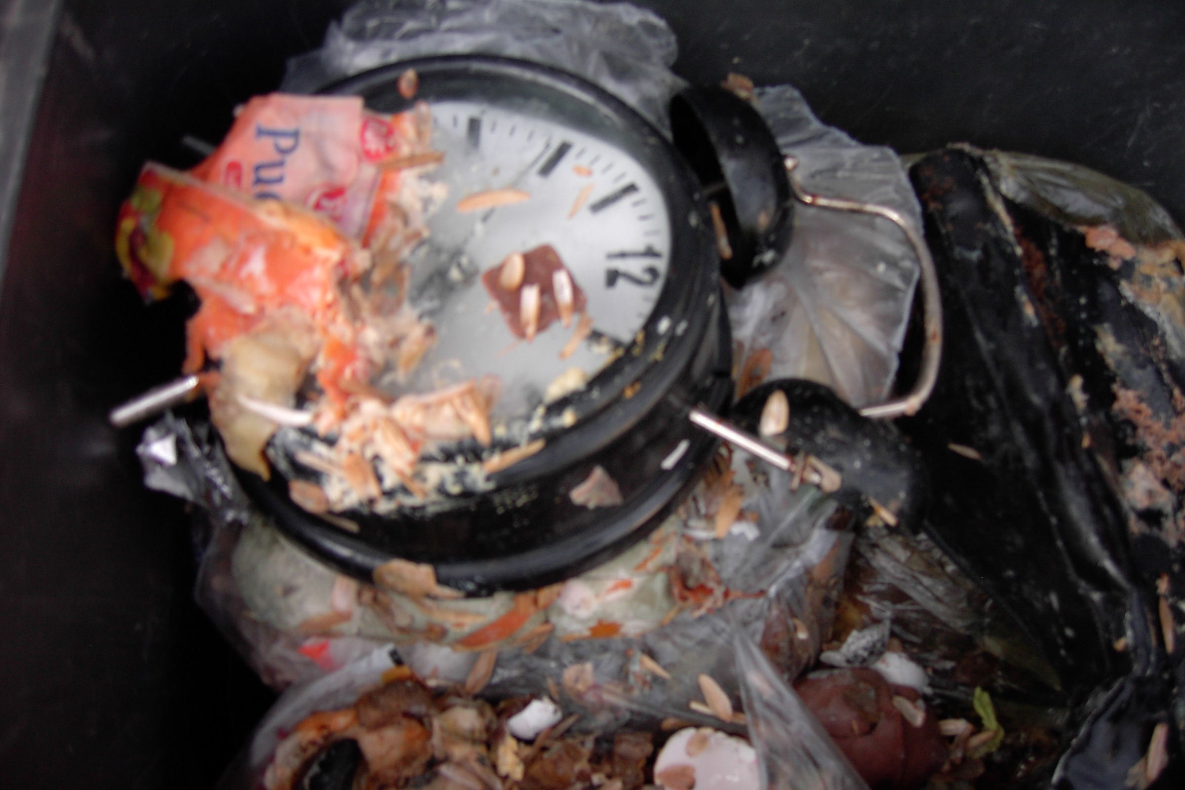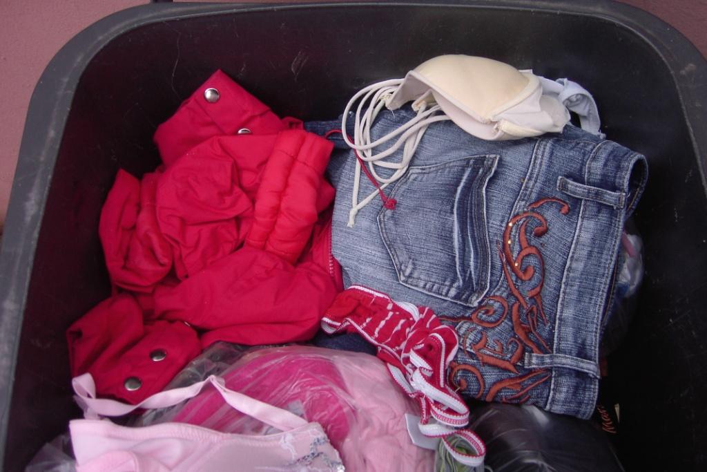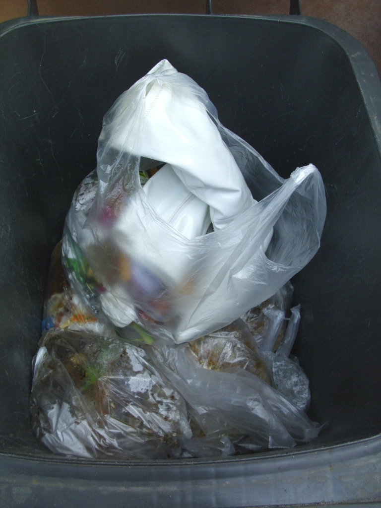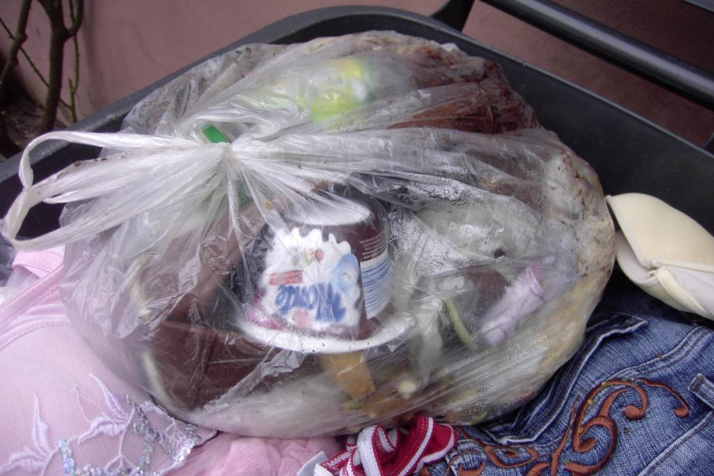 Durch die vielen Personen fällt natürlich einiges an „normalem“ Hausmüll an und auch nicht wenige Küchenabfälle. Aus Hygienegründen kommt davon nichts in die Biotonne. So ergibt sich eine „bunte“ Mischung in unserer Restmülltonne, die man gar nicht vollständig aufzählen kann: Nudelreste und Designerjeans, abgenagte Knochen zu Stringtangas, Kartoffelbrei klebt in Stiefeln, Zigarettenkippen sorgen für echt üblen Gestank in Sneakers, Kehrricht wird auf BHs geschüttet und auslaufende Parfum-Flacons in einer alten Handtasche, versuchen vergeblich gegen den penetranten Müllgeruch der Mülltonne „anzustinken“, zerschlissene geile Oberteile zu welken Salatblättern, verschwitzte, käsige Sneakersöckchen und Nylons liegen bei Badezimmerabfällen, abgestöckelte Pumps und verlatschte Ballerinas kriegen Glas- oder Porzellanscherben ab und ausgekratztes altes Frittenfett auf Mäntel oder Jacken, oder noch viel schlimmer: flüssigheiß in alte Stiefel gegossen.