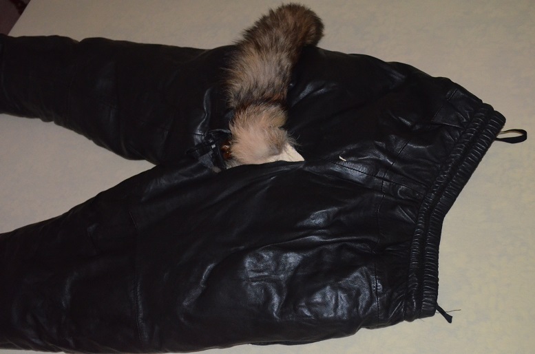 Hab aus der Lederhose das Nylon-Futter herausgetrennt und dann 6 Fuchsfelle hineingeklebt. Dazu hab ich einen speziellen Kleber verwendet der dauerelastisch ist.