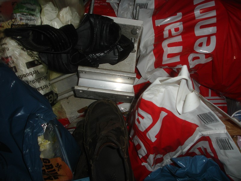 - dann ein größerer Fundus: zwar nur eine Schlappe und ein paar rote Socken, dafür auch noch zwei Säcke Klamotten und jede Menge Haushaltskrusch ... Bilder, CD's, Erinnerungsstücke und und und