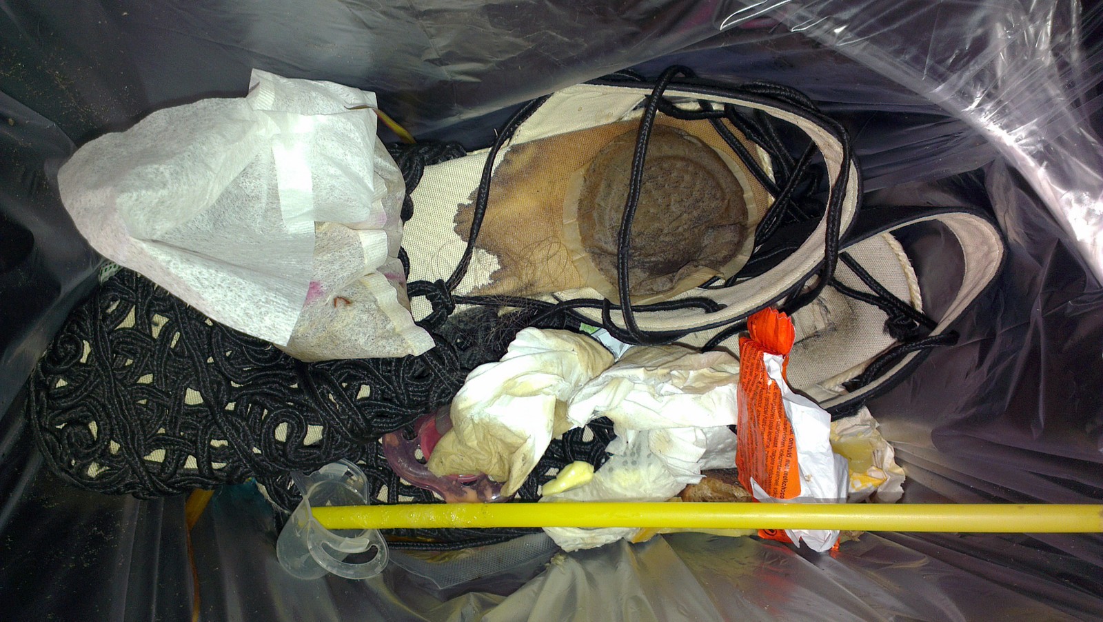 Nachdem die einst geliebten Teile nun Müll sind, schmeisst sie nun achtlos Haarbüschel, Kaffeepads und so weiter drauf. Kein Herz für die ollen Latschen.
