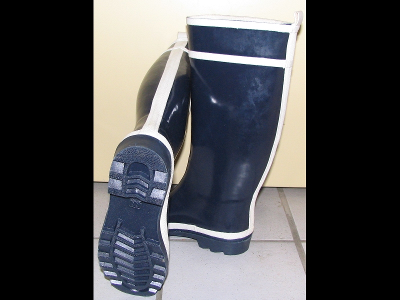 Zu Hause angekommen probierte sie beide Stiefel noch mal an und diesmal barfuss. Sie war entzückt über das aussergewöhnlich angenehme Gefühl das die weichen Gummistiefel barfuss und an den nackten Waden vermittelten. So angenehm dass sie die Stiefel nicht gleich auszog sondern sie den Einkauf noch in den Stiefeln wegräumte. Immer wieder sah sie runter und betrachtete die schicken blau weissen Gummistiefel. Auch sah sie sich im Spiegel an, drehte sich nach allen Seiten betrachtete sich und dachte sich sehen eigentlich klasse aus die Gummistiefel an meinen Beinen. Die kann ich ja auch zum shoppen anziehen wenns mal regnet. Zum Ausziehen der Stiefel setzte sie sich aufs Sofa. Als sie den Stiefel langsam vom Fuss zog berührte sie mit dem glatten kalten Gummi des Schaftes ihren nackten Oberschenkel an der Innerseite. Sie verspürt sofort ein angenehmes Gefühl über sich ergehen. Sie fährt mit dem Stiefel in der Hand noch ein paar mal an den Schenkeln entlang und sie bemerkt ein leichtes Ziehen zwischen ihren Beinen. Sie legt sich zurück greift in ihren Slip und reibt an ihrer bereits feuchten Vagina. Den Stiefel reibt sie immer wieder an ihren nackten Oberschenkeln. Den zweiten Stiefel hat sie noch immer an, barfuss. Mit den nackten Zehen stellt sie sich auf den zweiten noch angezogenen Stiefel. So bringt sie sich zu einem wunderbaren und ausserordentlich befriedigenden Orgasmus. Und alles nur wegen der Gummistiefel dachte sie sich. Sie zieht den zweiten Stiefel aus und stellt sie in die Garderobe. Bis Samstag ihr lieben Stiefelchen denkt sie sich und freut sich schon auf den ersten Outdooreinsatz der neuen Gummistiefel.