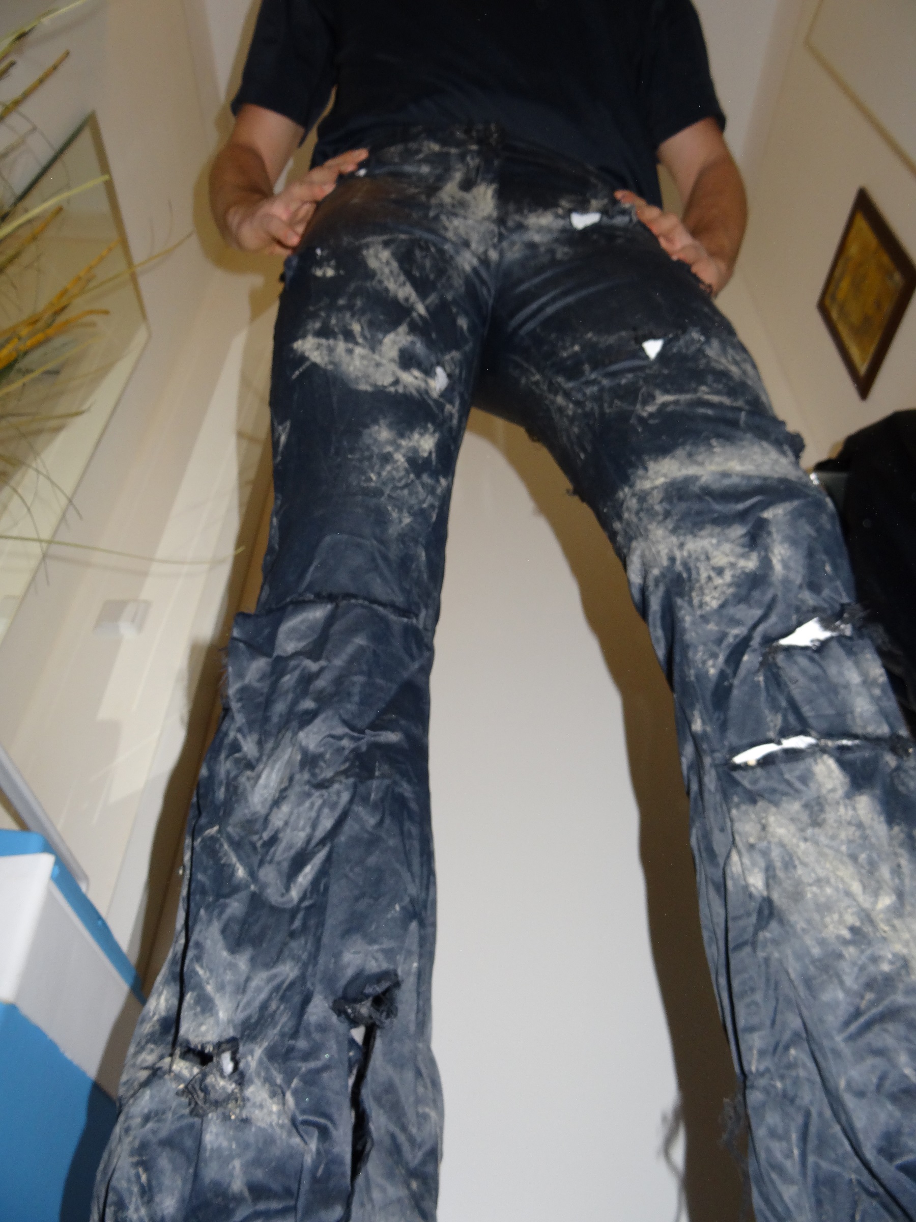 Nachdem ich die geile Hose mit dem Messer bearbeitet hatte, noch tragbar (lach) hab ich einen kleinen Spaziergang in der Hose gemacht. Auf dem Waldweg (gut besucht) kam mir die Idee die Hose auf den Weg direkt neben einer Mülltonne zu legen. Und siehe da nach einer halben Stunden war die Hose in der Tonne!