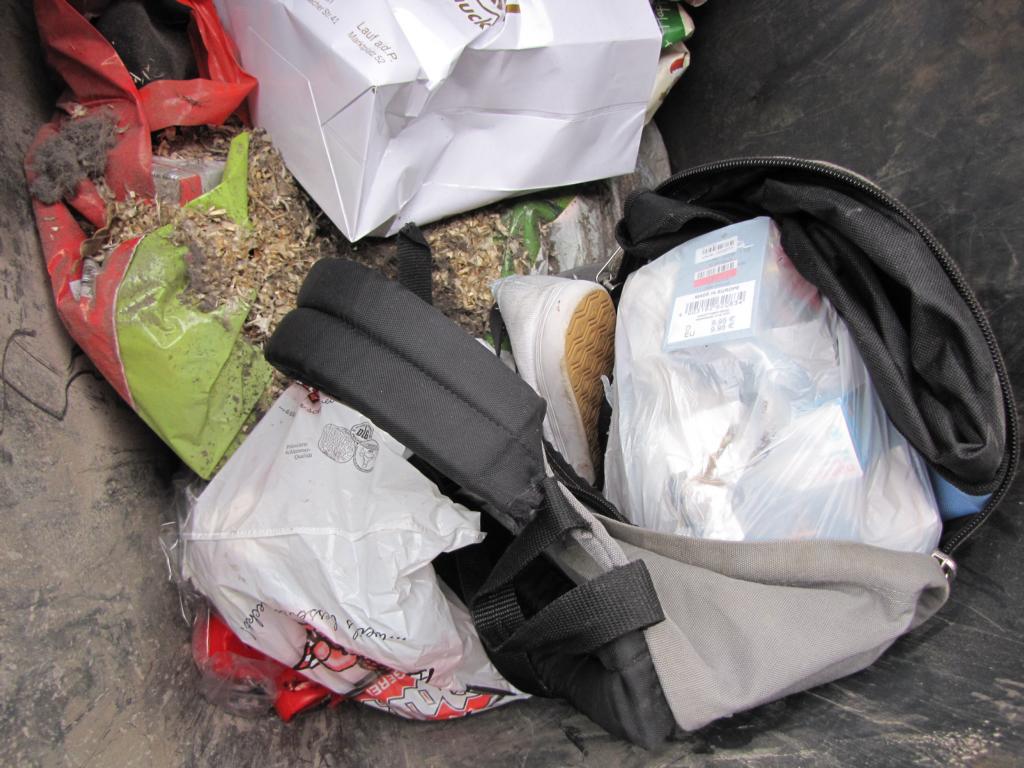Also erst in den Zimmermülleimer und dann wird der Rucksack mit einem Säckchen Badezimmermüll aufgefüllt und raus damit in die Restmülltonne und Richtung Müllverbrennung......