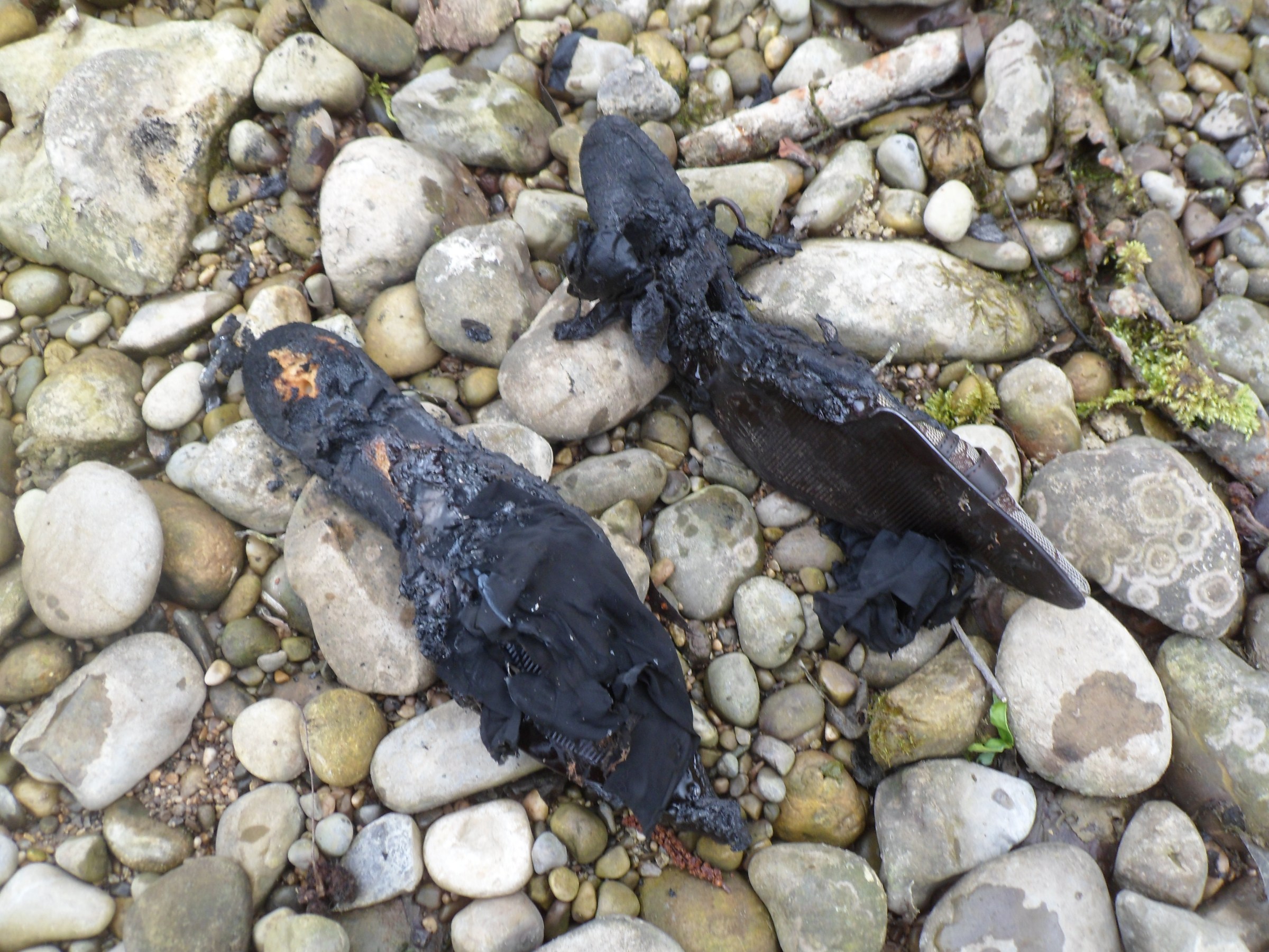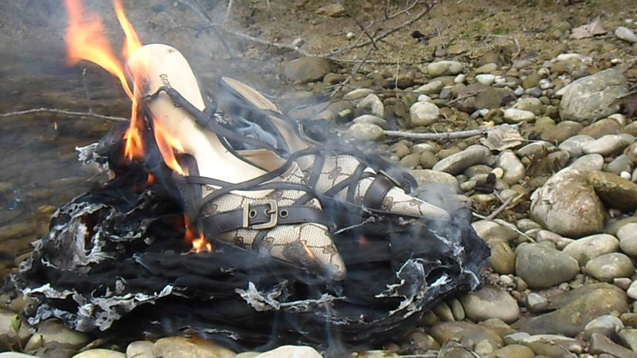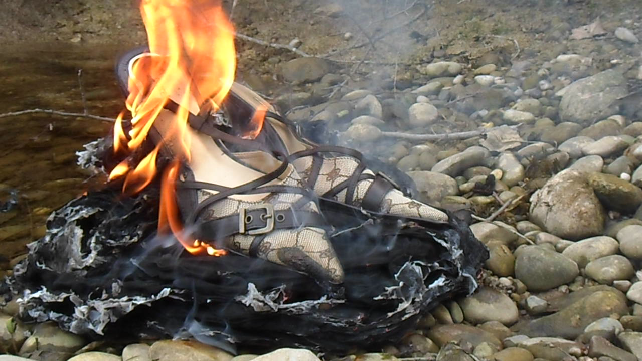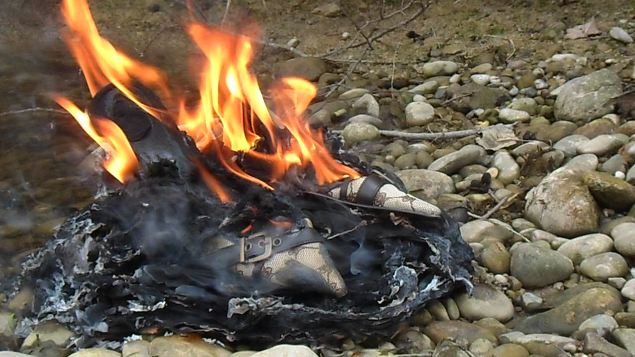 Besonders beeindruckend, leider auf den Bildern nicht wirklich gut zu erkennen, wie schön die Absätze brannten. Von Anfang bis zum Ende eine einzige Flamme, beim einen Schuh wurde er komplett zerfressen, beim anderen blieb noch ein Rest erhalten.