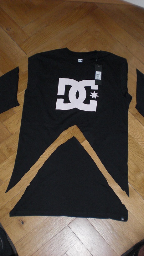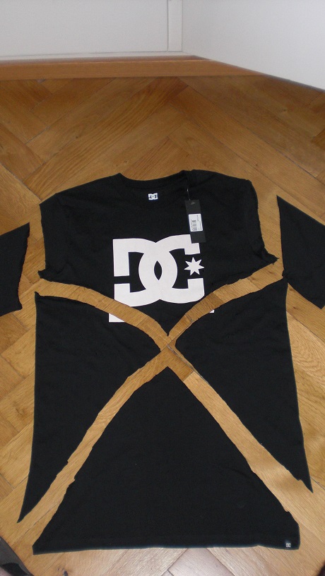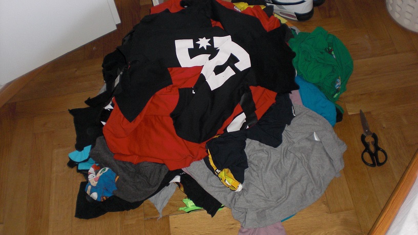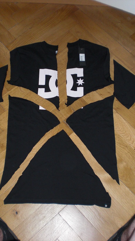 Das zerfetzte T-Shirt in seiner ganzen Pracht. Links ist das Rückenstück zu sehen. Das bekam nämlich eine kleine Sonderbehandlung.
