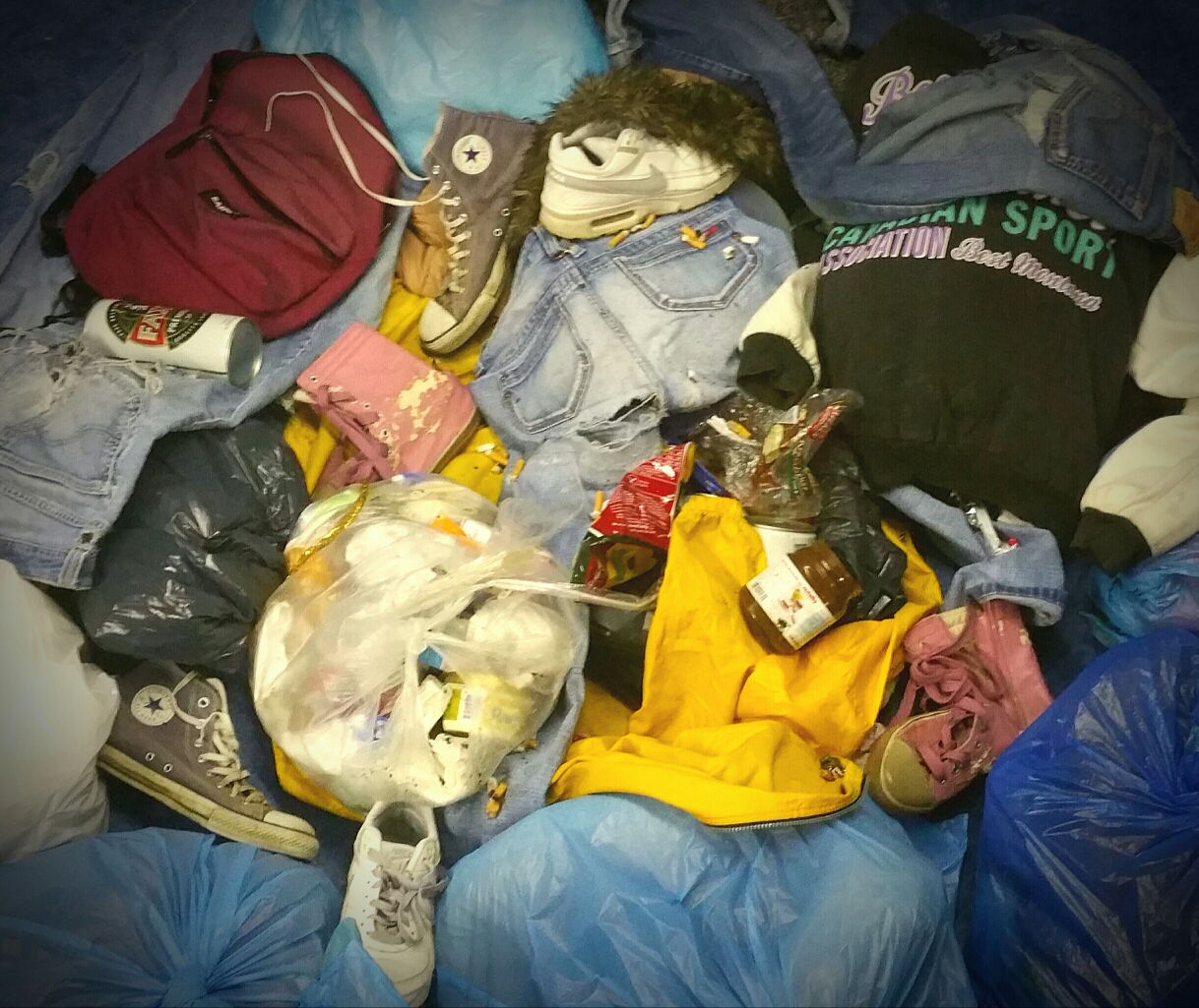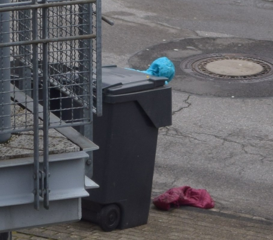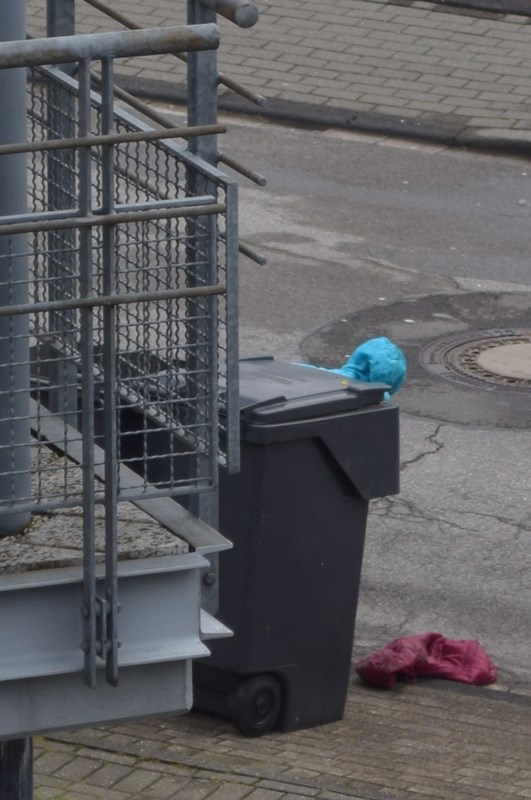 Fehlgeschlagene Entsorgung zweier Kinder Anoraks, den Rest hat der Hausmeister erledigt statt der Müllwagen