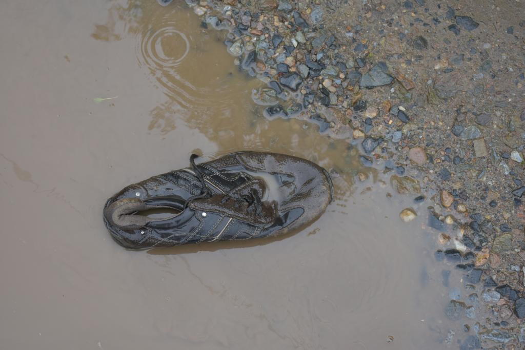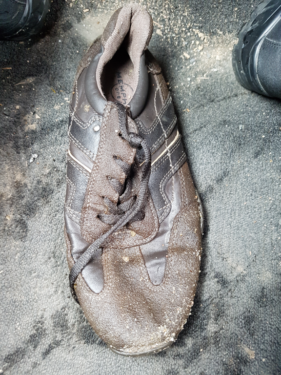 Auf einem Zufahrtsweg sah ich etwas "Verdächtiges" in einer Pfütze liegen,die Neugier packte mich,also hin und habe mir das genauer angeguckt,es handelte sich um einen abgelatschten Memphis One Schuh Gr.42 ,vom Partner leider weit und breit keine Spur....