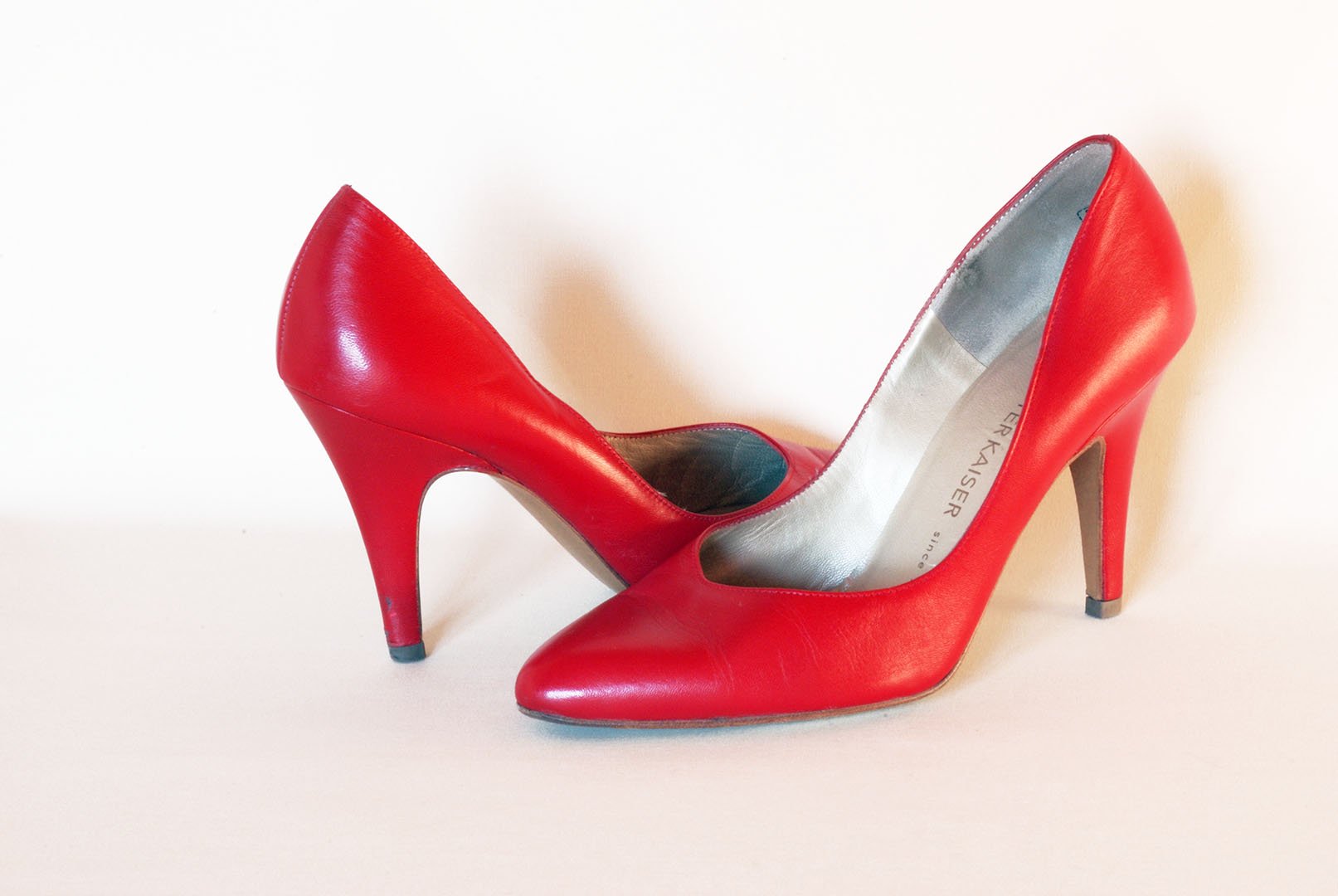 Wegen ein paar winzigen, kaum sichtbaren Macken am Absatz, sind diese roten Pumps von Peter Kaiser in der Mülltonne gelandet. Der Müllabfuhr sind die schönen Schuhe zum Glück nicht zum Opfer gefallen.