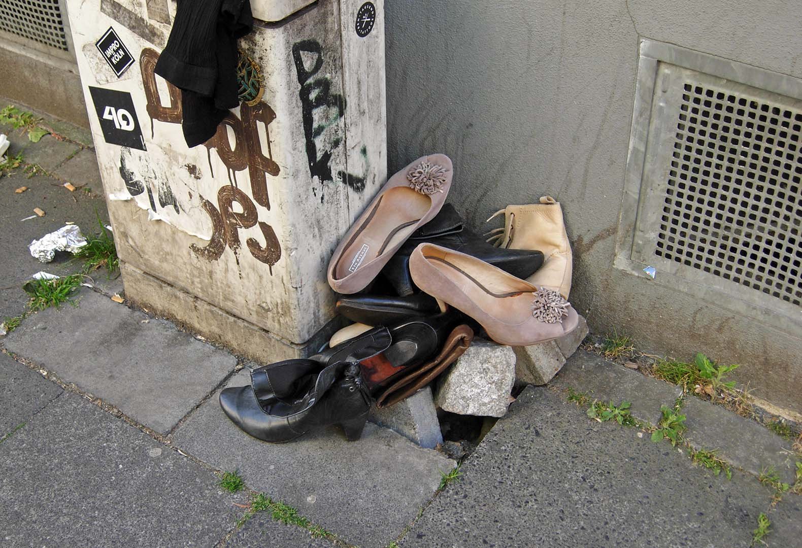 Am (Rest)-Müllabfuhrtag lagen ein Paar gut erhaltene Peeptoes und drei Paar abgetragene Stiefeletten auf der Straße. Offensichtlich wurden die Schuhe kurz zuvor aus einer zu Leerung bereitstehenden Mülltonne gefischt, und auf der Straße liegengelassen. Bevor die Müllabfuhr kam, wurden die Peeptoes gerettet, während der Rest anschließend vernichtet wurde.