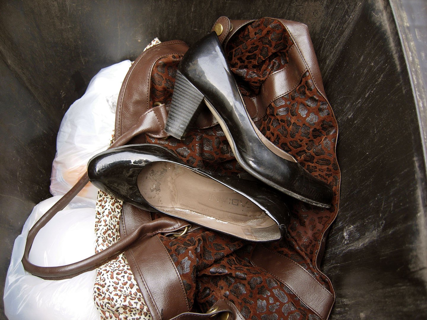 Solche Synthetik-Pumps von H&M mit Leoprintinnenfutter, waren vor etlichen Jahren sehr verbreitet. Noch heute tauchen solche Schuhe immer wieder auf, so wie diese, in einer zur Leerung bereitstehen Mülltonne. Der Müllabfuhr sind die Schuhe jedoch nicht zum Opfer gefallen.