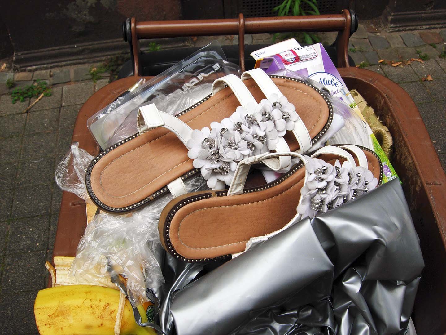 In einer Südstadt-Mülltonne warteten ein Paar neuwertige Ledersandaletten, und ein Paar billige Synthetikpumps auf ihr sicheres Ende in der Müllverbrennungsanlage. Um die Sandaletten mit minimalen Gebrauchsspuren, wäre es wirklich schade gewesen. Die billigen H&M-Pumps waren eigentlich wertlos, wurden aber ebenfalls gerettet.