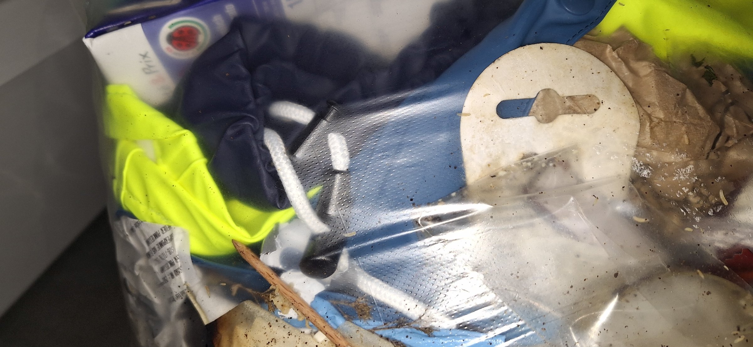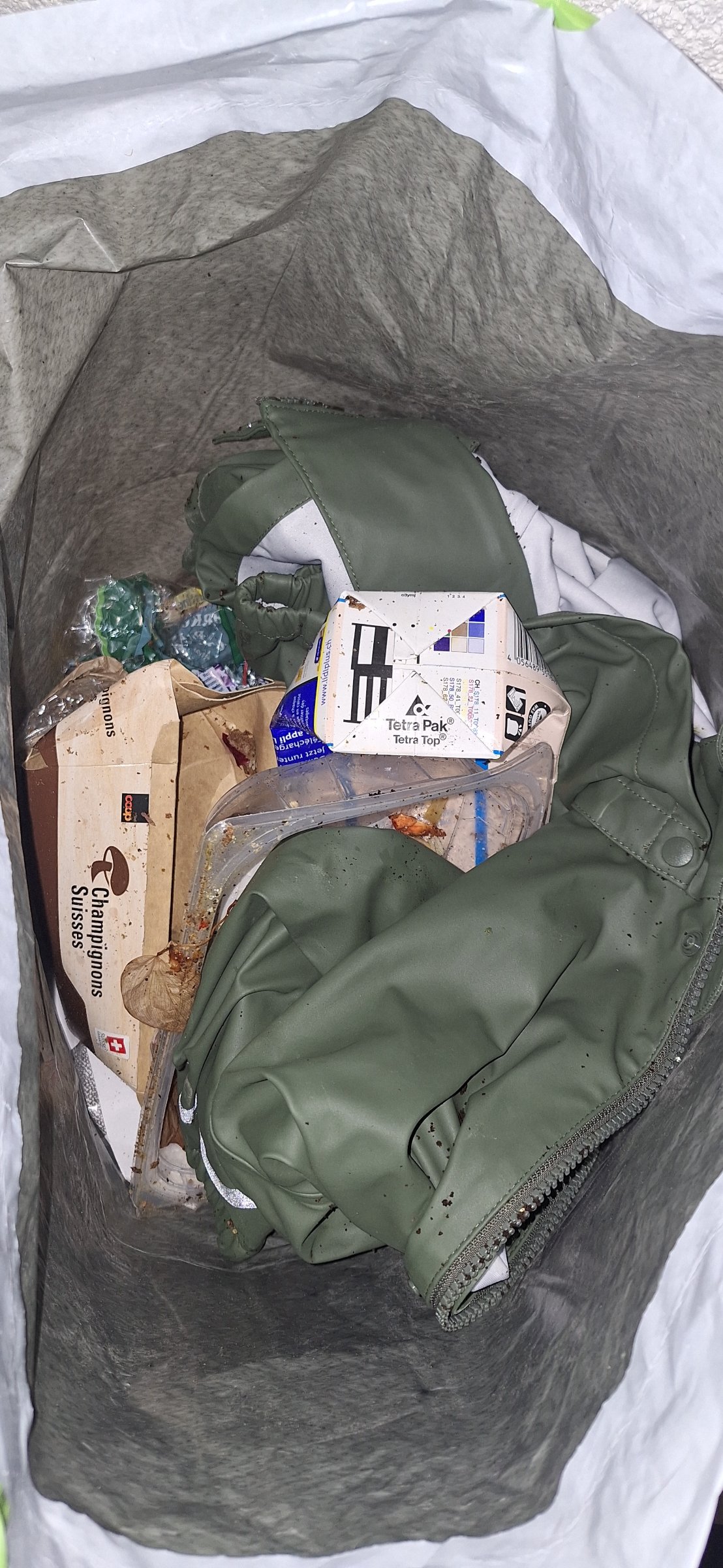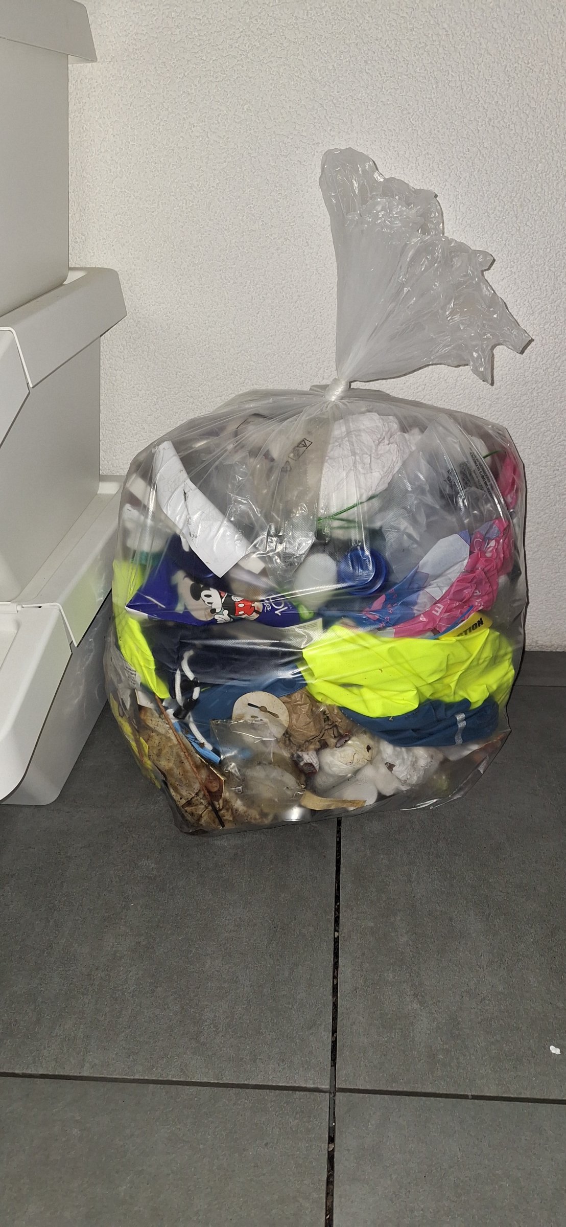 Es waren vermutlich Kleidung von Kindern. Es sah nach Matschhosen aus. Von Aussen konnte man noch so einiges sehen. Es stank ziemlich nach Müll und auch Maden waren schon fleissig am Werk. Es wuselte da drin. Richtig eklig. Ich wollte ihn noch öffnen, aber er war so stark zugeschnürt, das ging nicht. Keine Chance noch an was heranzukommen.