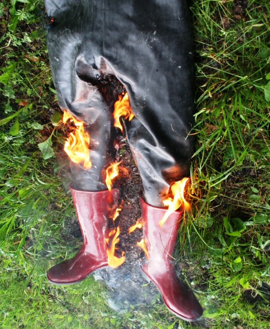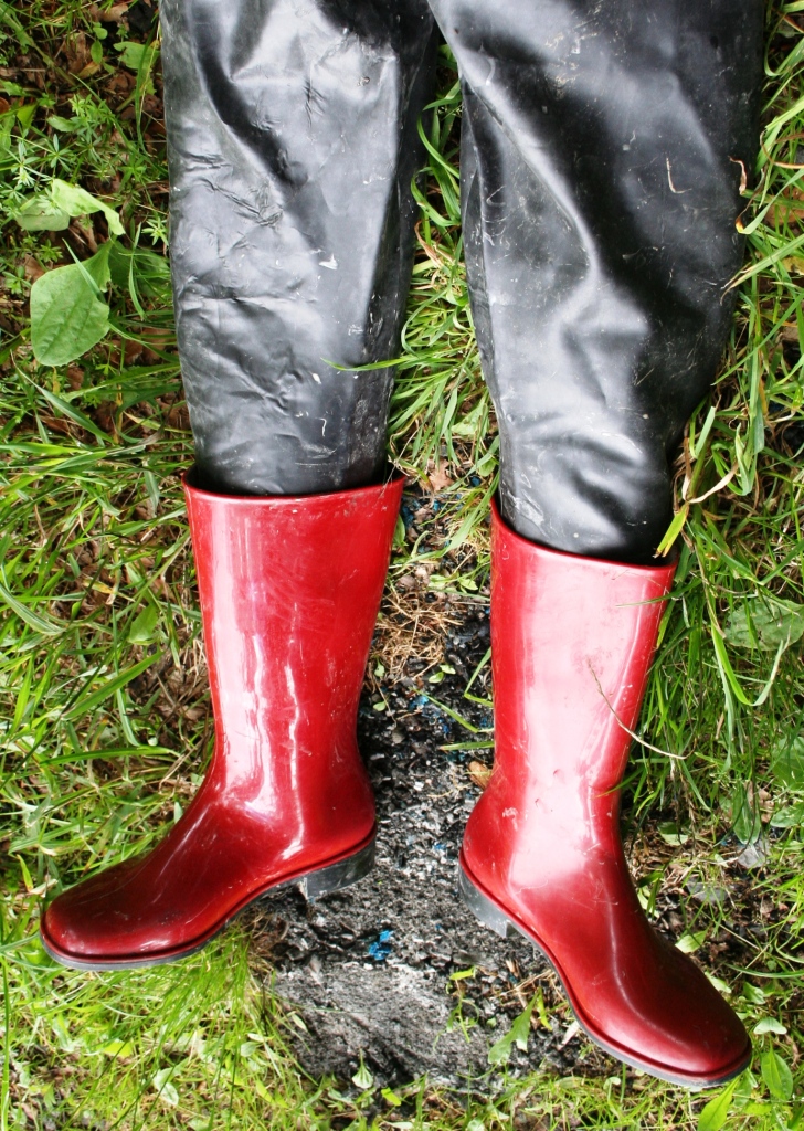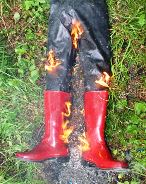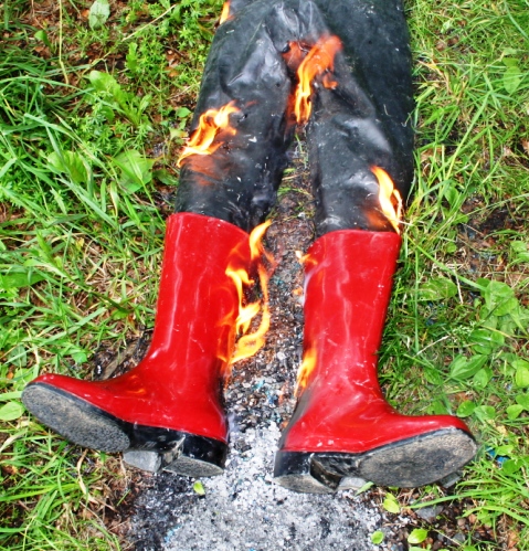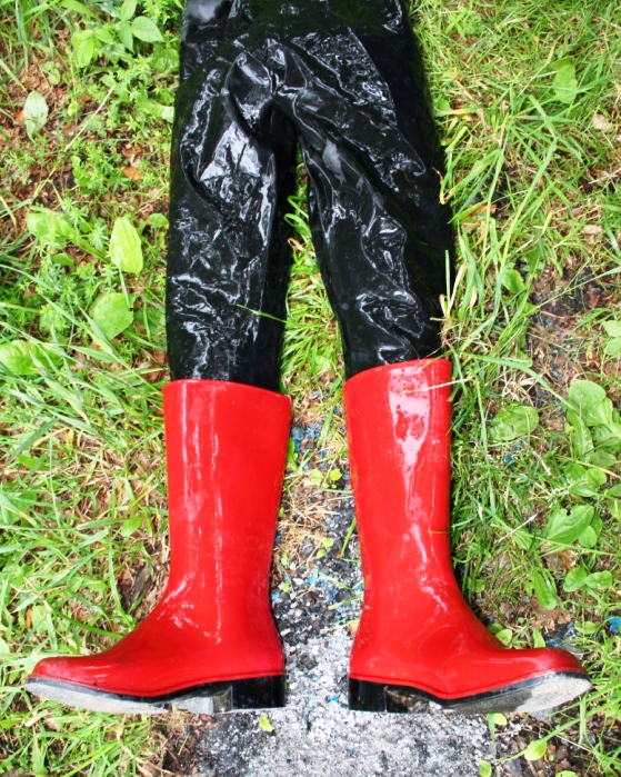 Die Gummihose war deutlich in die Jahre gekommen und die ehemals schönen dunkelroten Gummistiefel ( aus PVC ) von Romika mit schwarzer Sohle hatten mit dem feuchten Schaft auf schwarzem PVC oä. von einem ebenfalls noch feuchten Lackmantel gelegen. Dem Mantel war nichts passiert. Die Stiefel hatten aber dunkle, unansehnliche Flecken bekommen. Zum arbeiten hätte man oder besser frau sie ja noch anziehen können. Aber sie sollten von einem Model auf Fotos getragen werden. Dazu waren sie absolut nicht mehr zu gebrauchen. Was also tun ? Die Entscheidung fiel nicht allzu schwer. Von unbrauchbaren Dingen sollte man oder frau sich am besten trennen. Bevor sie ihren Weg über eine Mülltonne in den Müllwagen und von dort in die Müllverbrennungsanlage antraten wurden sie schon mal "vorgewärmt"