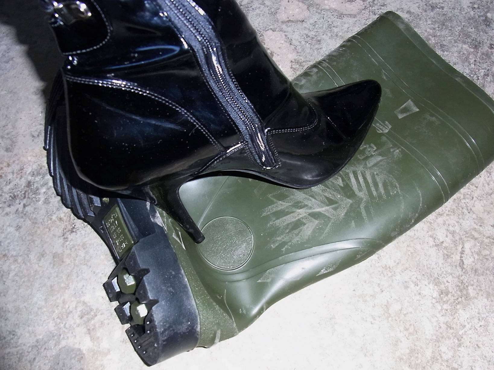 Die Gummistiefel sehen verdammt stabil aus, da war die Wahl sie etwas anzuwärmen um sie dann für Deine Stilettos gefügig zu machen die Richtige.