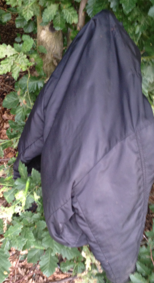 Heut morgen habe ich sie in den Wald gebracht und hab erst den Reißverschluss zugemacht und hab sie dann an einer einsamen Stelle an einen Baum gehängt.Nach dem Winter hole ich sie wieder ab