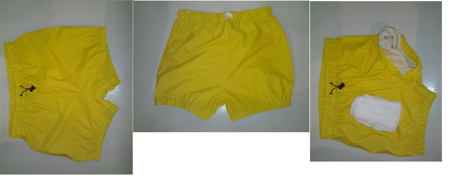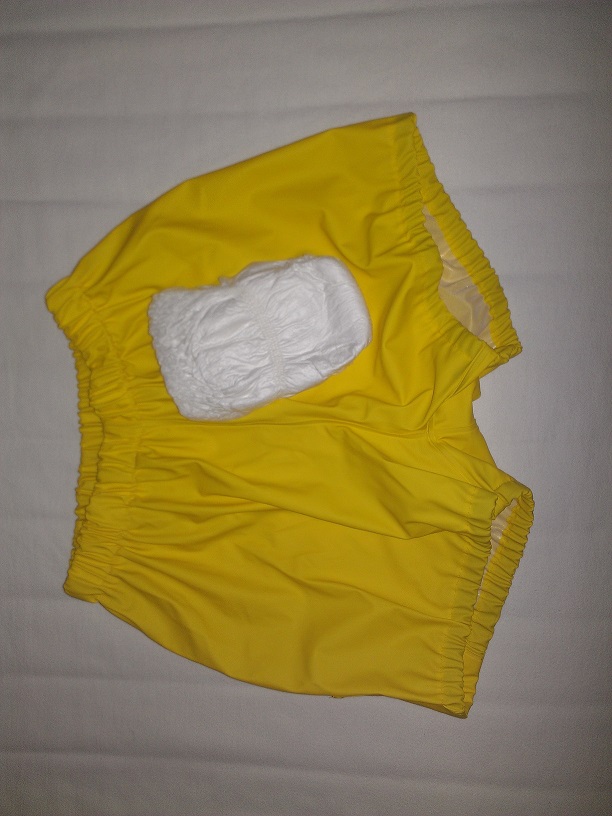 Hier sieht man die gelbe etwa eine Minute vor ihrem ersten Einsatz. Man sieht auch die Einlage, welche hier noch zusammengefaltet ist. Sobald diese "benutzt" werden quellen diese deutlich auf und werden aussen feucht, deshalb die Ueberhosen. Wie schon gesagt, wandert diese hier wohl nächstens in den Schredder.