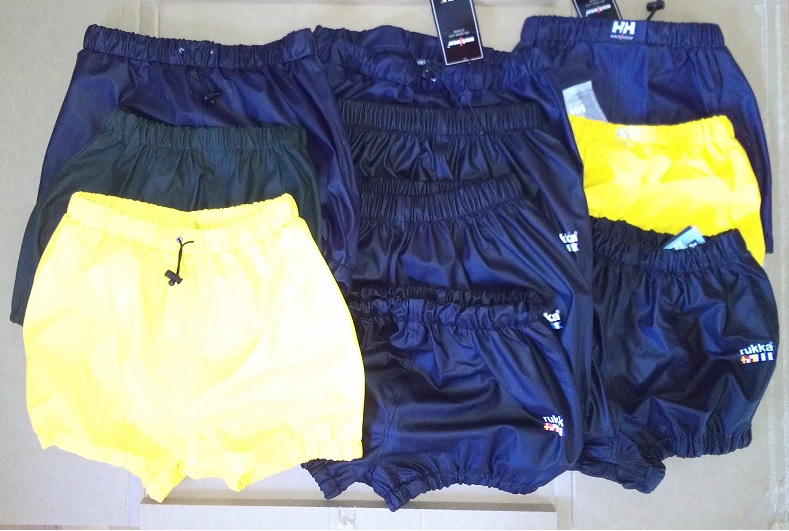 Diesmal gab es neben der schon verwendeten Rukka noch neue von Helly Hansen in gelb und dunkelblau. Diese sind zwar etwas weniger weich als die Rukka aber dafür auch billiger. Das Beste ist, dass die Blauen innen sogar schwarz sind. D.h. wir hoffen, dass diese innen weniger Dauergebrauchsspuren bekommen werden.