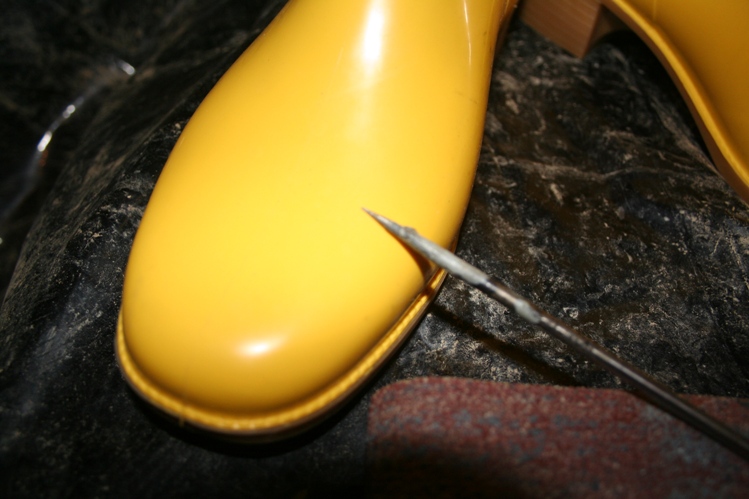 Die Sohlen waren wohl noch nicht mit dem Boden in Berührung gekommen. Deshalb entschloss ich mich, sie ein wenig mit der Schleifmaschine zu bearbeiten. Vorne ging die Sohle dann verloren, das gelbe Material wurde sichtbar.
