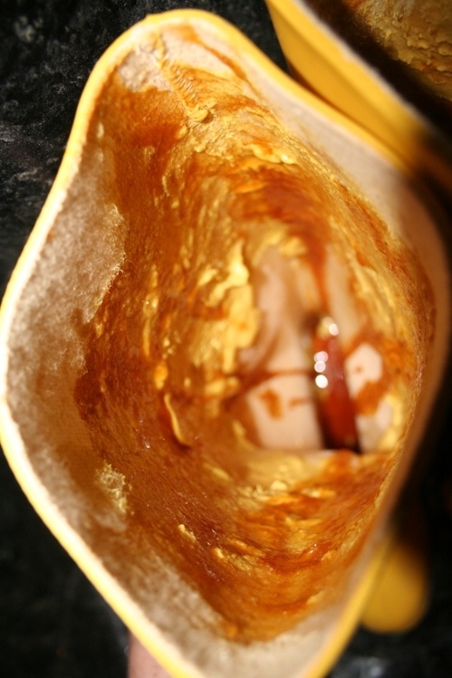 Bauschaum dehnt sich aus. Diese Gummistiefel wurden ja erst mit Hosenbeinen einer Jeans gefüllt und dann habe ich Bauschaum bis möglichst weit in die Spitze eingefüllt bis etwa zum Ende des Schafts. Nach dem erhärten habe ich die Jeans mit Bauschaum gefüllt, das Ergebnis war wenig ansehnlich. Also wurden im Bauschaum gebuddelt und die entstandenen Lücken erneut gefüllt. Das war schon besser. Die Jeans in den roten Gummistiefeln habe ich am Bund aufgehangen und dann ausgespritzt. Die Gumistiefel waren wieder zuvor gefüllt. Die Jeans hatten die gleiche Größe wie die in den gelben, aber wie deutlich zu sehen ist, wurden sie vom Bauschaum regelrecht aufgepumpt.