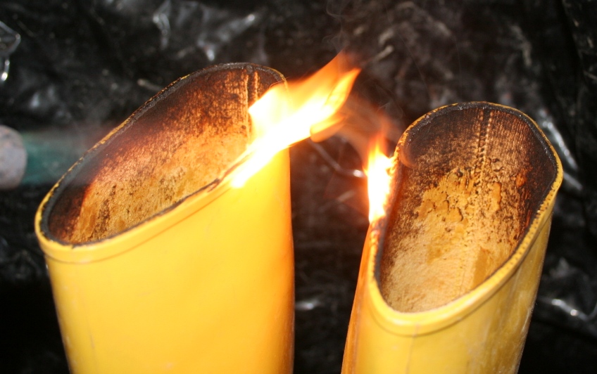Nachdem die Gummistiefel nun innen versifft, außen zerkratzt, die Sohlen schief und angebrannt und die Stiefel zudem undicht waren, ging es ihnen nun an den Kragen. Also ans obere Ende der Schäfte. Zunächst innen ein wenig grillen.
