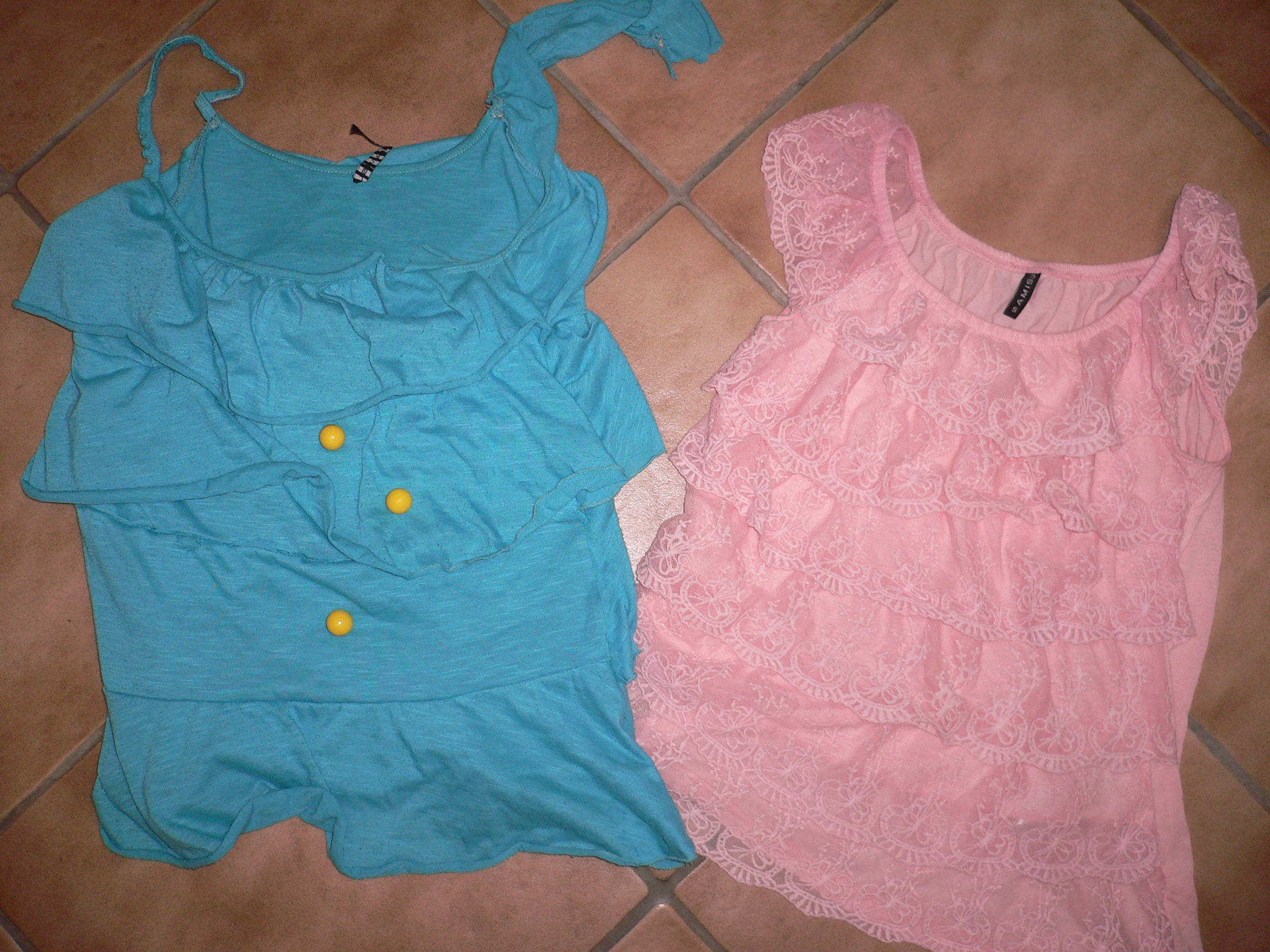 Ich habe mir vor ein paar wochen 6 gebrauchte Volanttops ergattert. Da diese nicht mehr unbedingt schön aussehen, werde ich sie nun langsam quälen. Das eine rosa Teil wurde schon etwas gedehnt (von S auf L) und die Etiketten sind alle "gefühlvoll" entfernt worden.