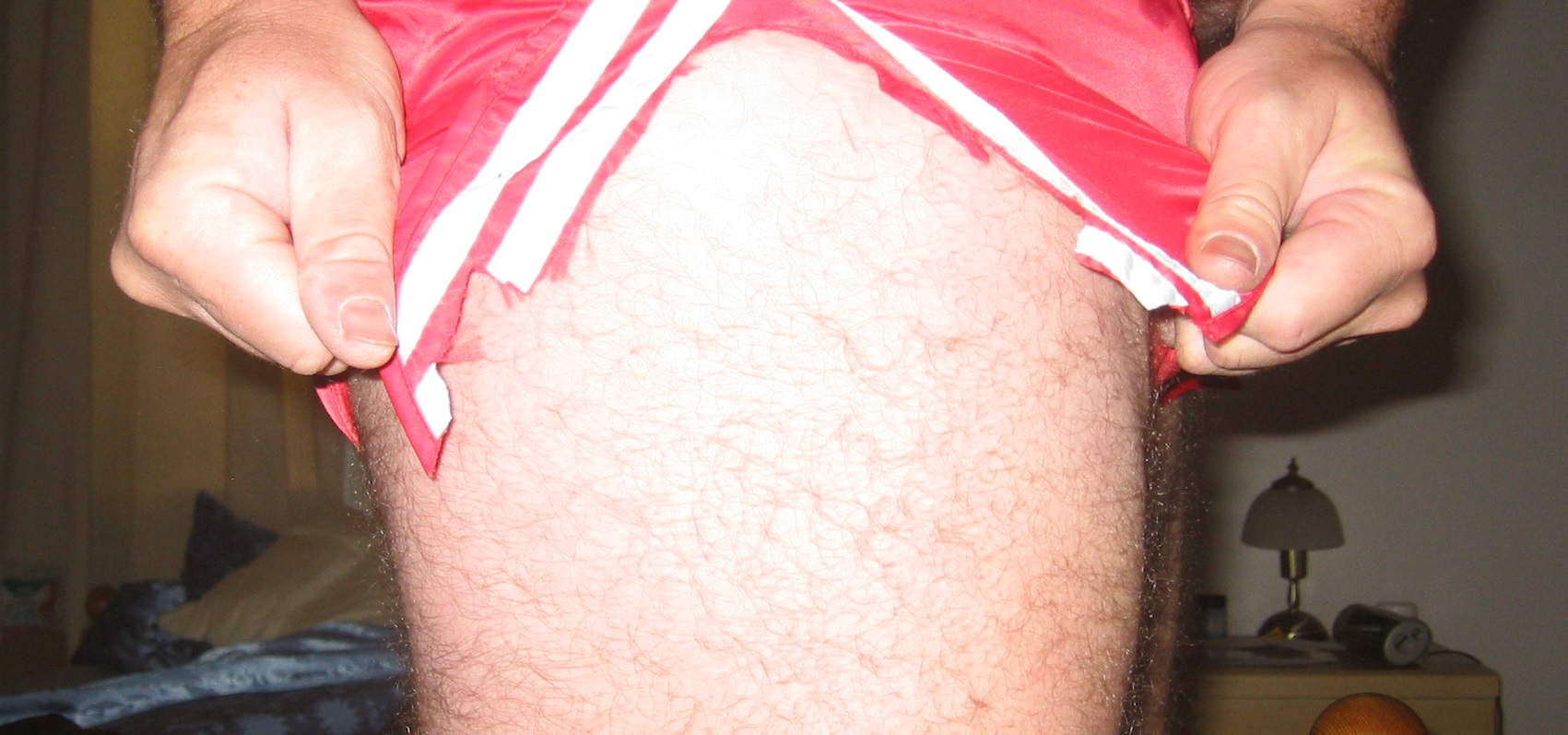 (Hier hatte ich übrigens vorher eine knallenge weisse Satin Hose an, die ich mir auch in Fetzen vom Leib geschnitten habe. Normalerweise mache ich das nicht alleine, aber ich hatte echt mal Lust drauf....)